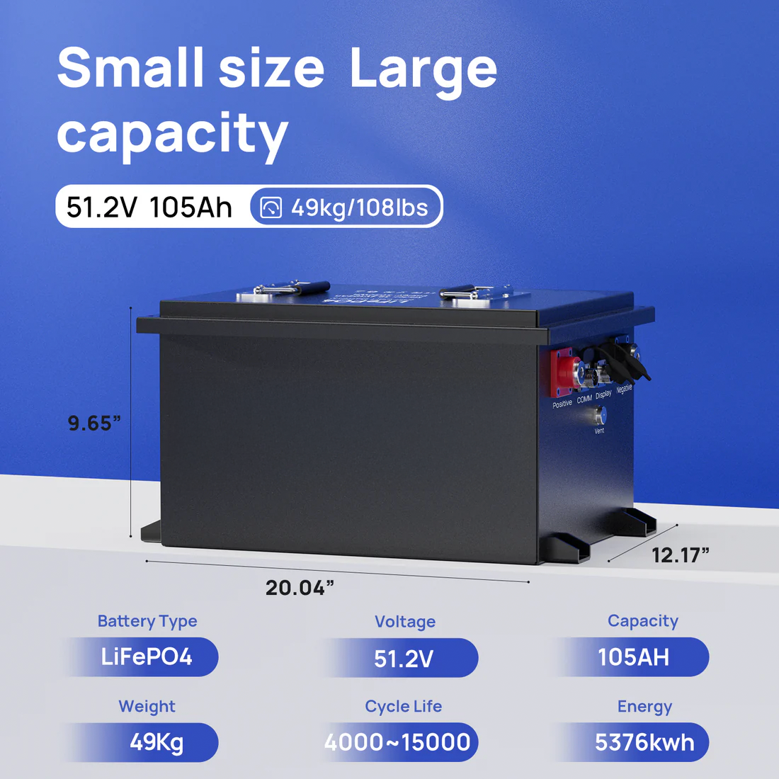 - [ADVANCED TECHNOLOGY] 51.2V 105Ah LiFePO4 Battery is made of A-grade automotive grade cells, which are safe, non-toxic and renewable energy. Lithium LiFePO4 is lighter weight, smaller size, longer service life, higher energy density, safer, and more cost-effective than sealed lead-acid batteries. Lithium LiFePO4 is the safest technology available, with an advanced battery management system for optimal performance.