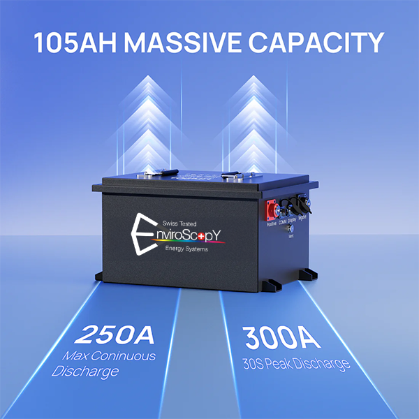 - [Unleash the power] 51.2V 105Ah LiFePO4 Battery with built-in 250A BMS to protect your LiFePO4 battery. Constant Discharge 250A (Peak 300A 30S), Usable Energy:5.376kwh, Maximum Load Power:10.24kw, which is twice the power of similar lead-acid batteries. Charging time (from 20%~100%) is about 4 hours, and the charging speed is 4 times faster, so you can get back to the race and no longer need to take a long break.